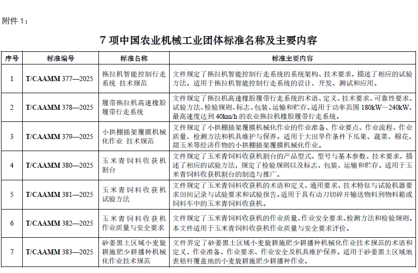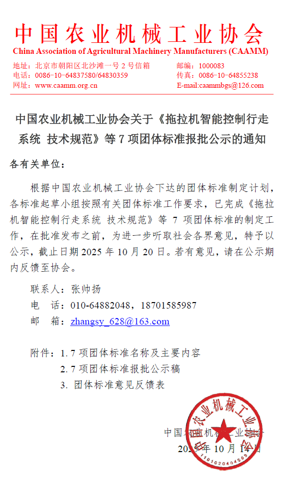 中國(guó)農(nóng)業(yè)機(jī)械工業(yè)協(xié)會(huì)關(guān)于《拖拉機(jī)智能控制行走系統(tǒng) 技術(shù)規(guī)范》等7項(xiàng)團(tuán)體標(biāo)準(zhǔn)報(bào)批公示的通知